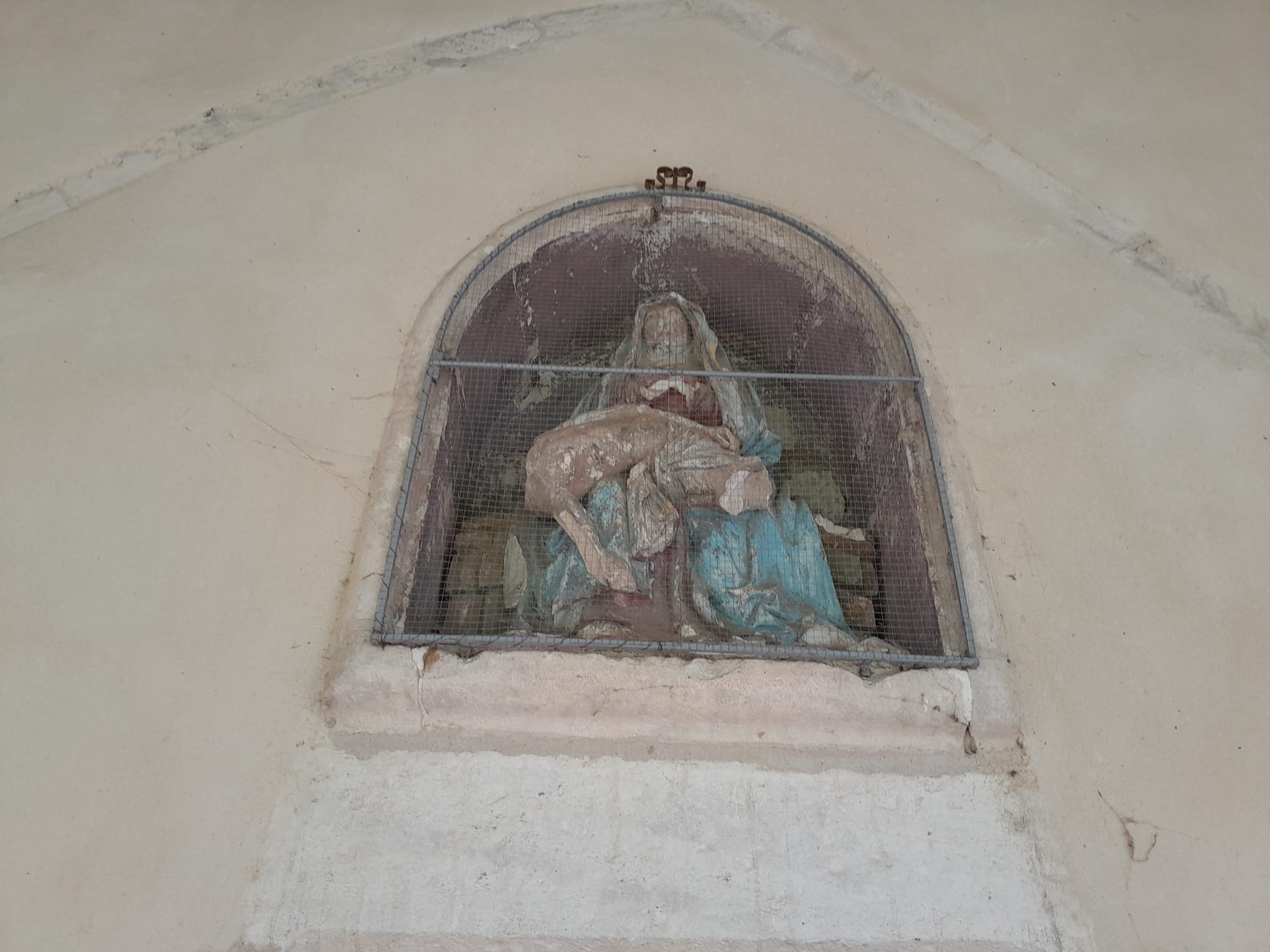 Nous continuons notre montée pour arriver au plateau et découvrir la chapelle du village. C’est l’ancienne église paroissiale, endommagée et jamais reconstruite. Seul le chœur est toujours debout, ce qui explique la forme particulière de l’édifice. Une belle piéta, malheureusement non restaurée, orne l’entrée.